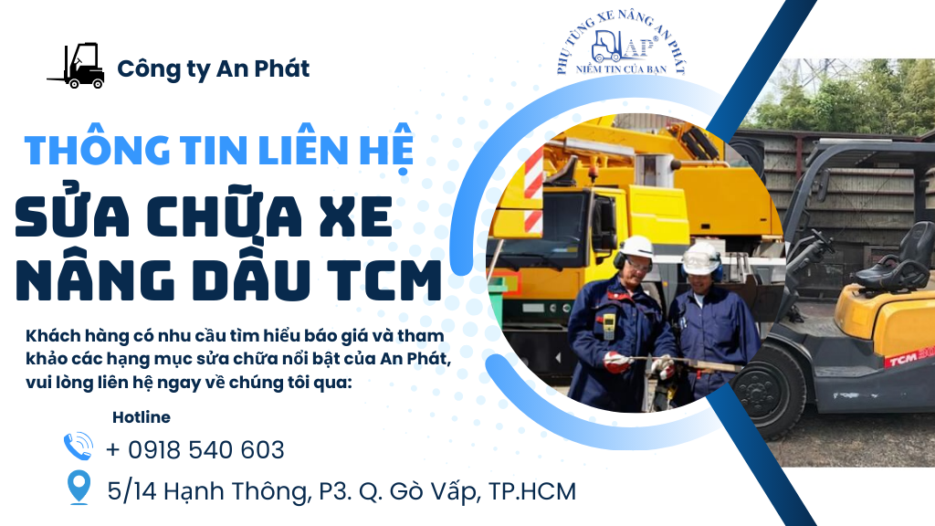 Công ty An Phát là một trong những địa chỉ uy tín trên thị trường cung cấp các dịch vụ sửa chữa xe nâng dầu TCM chất lượng, hỗ trợ cho khách hàng nhiều dịch vụ sửa chữa và thay thế phụ tùng chính hãng, góp phần nâng cao hiệu suất và đồng thời giảm thiểu các hư hỏng đối với xe nâng dầu TCM. Khách hàng nếu đang có các nhu cầu sửa chữa xe nâng TCM, hãy liên hệ với An Phát để nghe tư vấn và hướng dẫn đặt lịch sửa chữa sớm nhất.